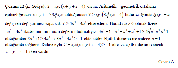 çözüm 12: 3a4 - 4a3 ifadesinin minimum değerini türev yardımıyla da bulabiliriz. Olimpiyat müfredatına uygun olsun diye ortalama eşitsizliğiyle çözüme gitmeyi tercih ettik.