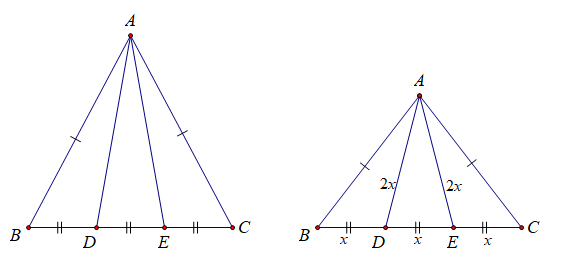 $\text{III.}$ $|BD|=|DE|=|EC|=x$ değeri verilirse $ABC$ ikizkenar üçgeninin $A$ dan inen yüksekliği keyfi olarak değiştirilebildiğinden $|AD|=|AE|=2x$ olacak şekilde bir yükseklik ($x$'e bağlı olarak) belirlenebilir. $|AD|=|AE|=2x$ olan yalnız bir üçgen vardır. Bu çizim mümkündür.