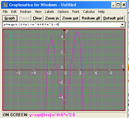 x > 0 olmak üzere (3 + x)1/2 = x4 - 6x2 + 6 olduğunu görebiliriz. Bu halde y = (3 + x)1/2 ve y = x4 - 6x2 + 6 fonksiyonlarının grafiklerinin kesişim noktaları bulunmalıdır. Klasik grafik çizim yönemleri ile bu eğrileri çizmek kolaydır. (Alper hocam, siz zaman ayırıp bir çizim gönderebilirseniz sevinirim) ikisi negatif, ikisi pozitif olmak üzere dört tane kesişim noktası bulunur. negatif sayılar orjinal denklemi sağlamayacağından, verilen denklem iki tane reel çözüme sahiptir.