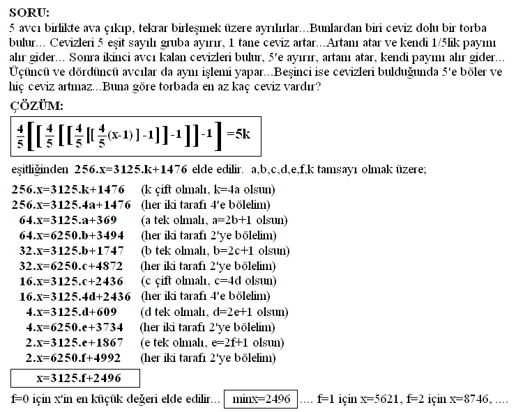 En sonunda gruptaki herkes uyanıp yaptıklarını birbirlerine anlatmışlar. Sonuç olarak kalan cevizleri 5 eşit parçaya bölmüşler. Ve yine artan bir adet cevizi sincaba vermişler.