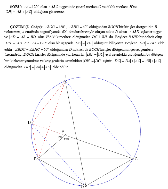 bir üçgenin diklik merkezi ile çevrel çemberinin merkezini birleştiren doğru bu üçgenin açılarından birinin açıortayına paralel ise bu açı kaç derecedir?