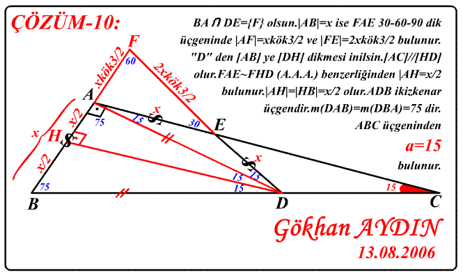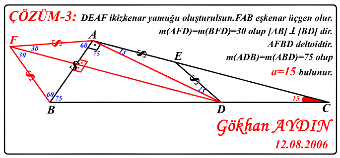 ikici sorunun çözümünde tersten gittim. <EDC = 30o iken <DCB = 15o olan bir soru vardı.ABFD karesini çizince DFE bir eşkenar üçgen oluyor.