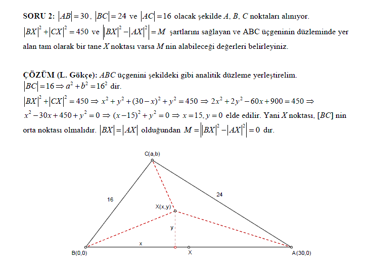A(0,0), B(30,0), C(a,b) X(x,y) alarak koordinat sistemine yerleştirebiliriz. Burada a ve b irrasyonel sayılar olduğundan gerçek değerlerini denklemlerde yazmayacağız. a,b olarak kullanacağız. BX2 + CX2 = 450 denkleminden