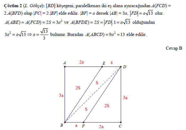 Karenin kenarı 3a olsun. Üçgenlerin alanı 3a2, dolayısıyla da kısa kenarları 2a ve hipotenüsleri a kök 13 olacak. Parelelkenarın alanı (a kök 13)*1 = 3a2 ise 9a2 = 13 elde edilir.