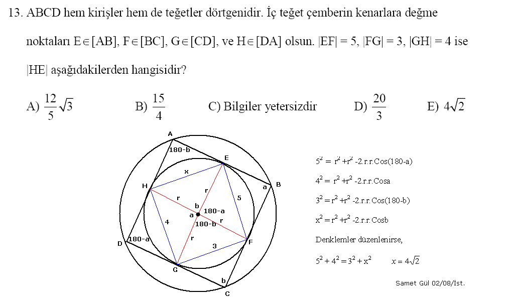 karenin F, G köşeleri sırasıyla [AC], [AB] kenarları üzerindedir. AGD ve AFE üçgenlerinin ikizkenar olduğu görülerek <DAE = 30o bulunur.eşkenar üçgenin bir kenarı x ise karenin bir kenarı x.(2.31/2 - 3) olur. eşkenar üçgenin kenar uzunluğununun irrasyonel olması gerekmez. örn: x = 2.31/2 + 3 için karenin bir kenarı 1 olur. AD, EF ve C'ye ait yüksekliğin aynı noktada kesişmediği aşikardır. 1 ve 3 doğrudur. Cvp C.