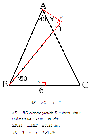 |AB| = |AC| ve ∠BAC = 40o olan ABC ikizkenar üçgeninde